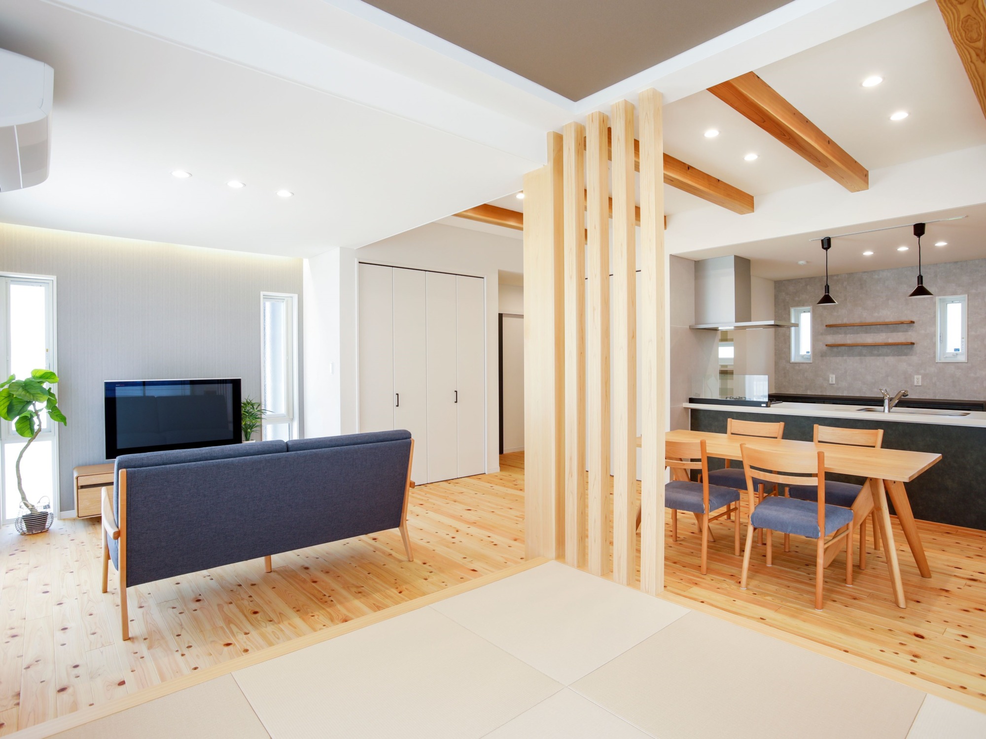 無垢材で彩る木づくり空間と、リビングとつながる小上がりの畳スペースが魅力的✨