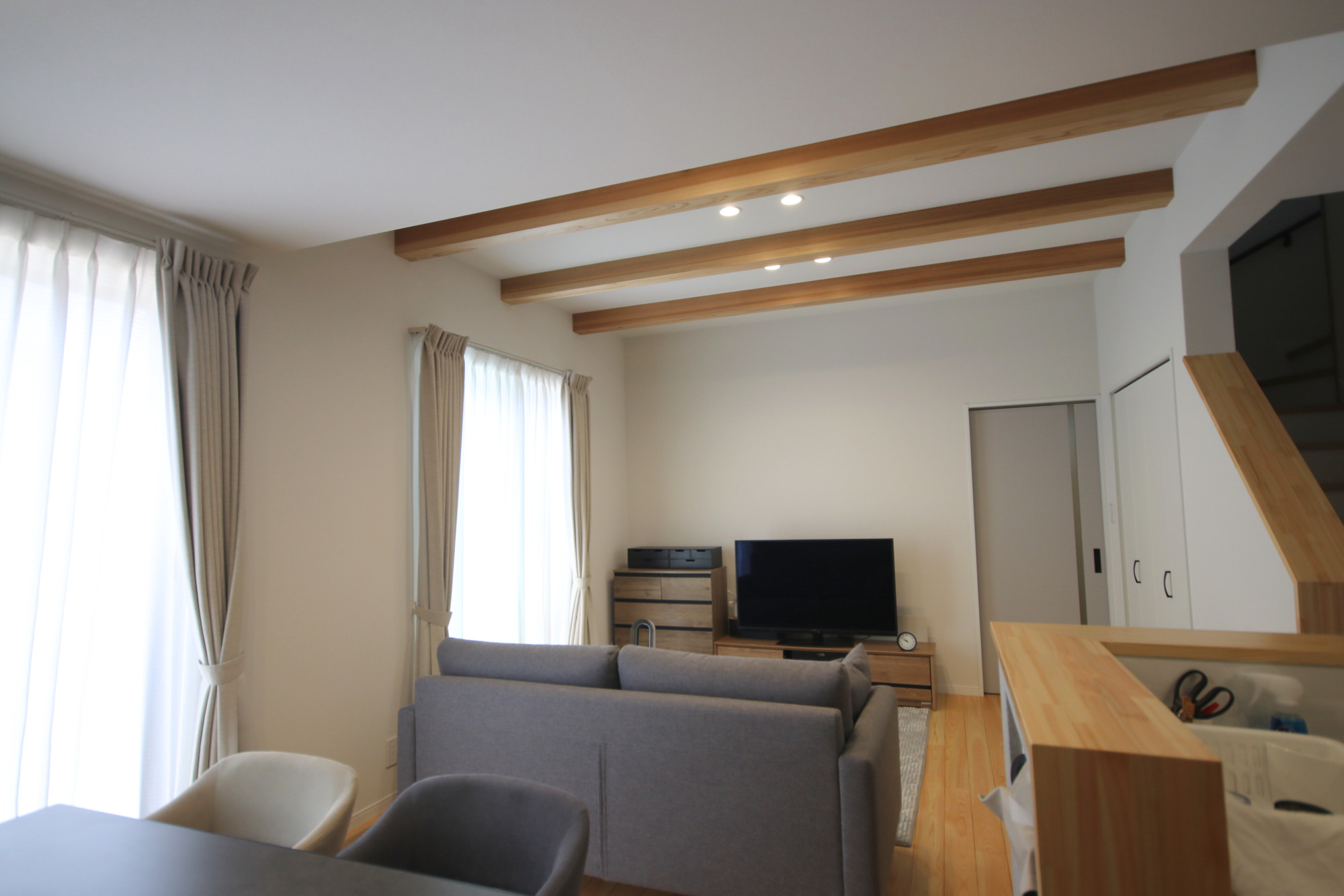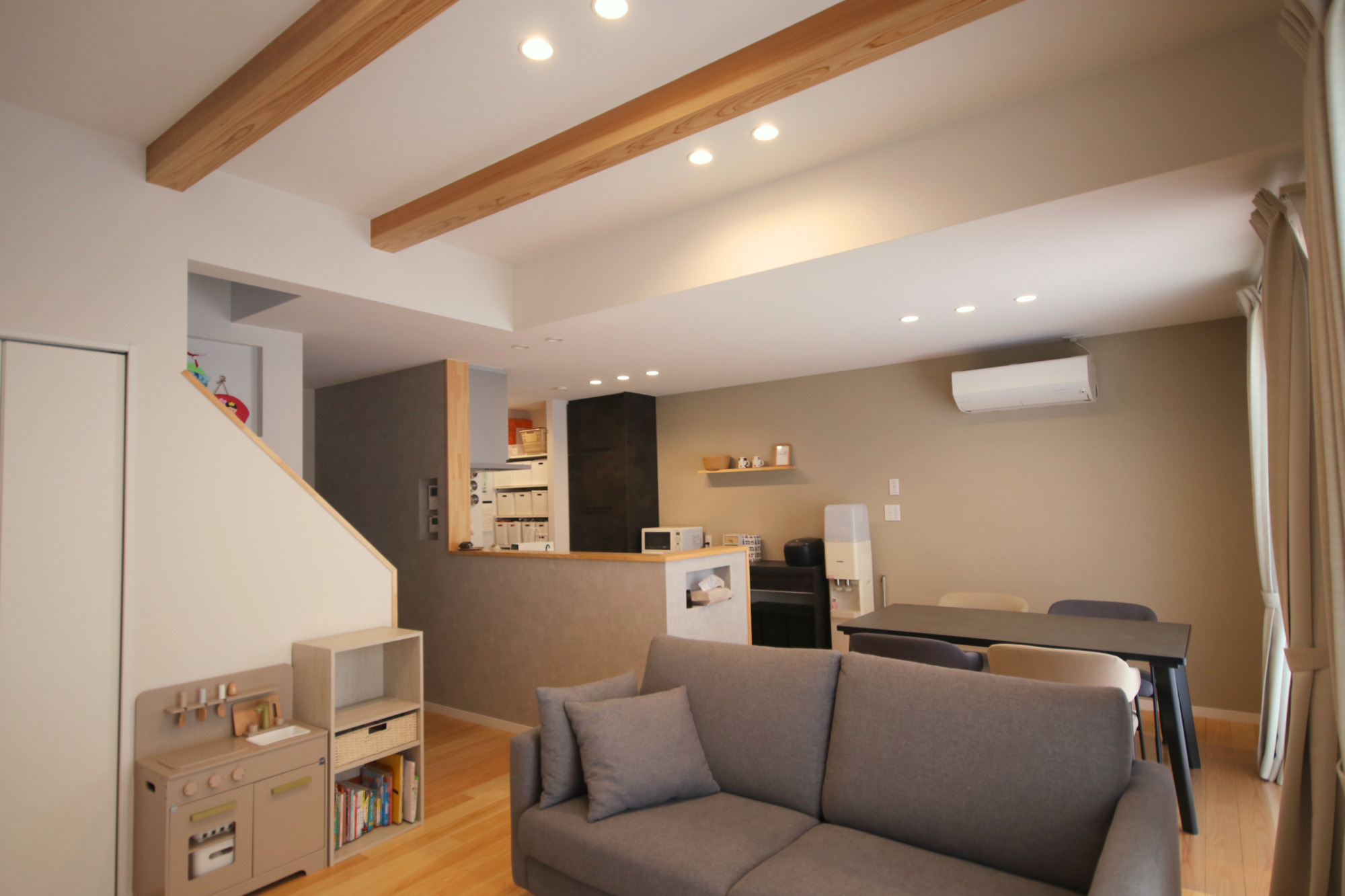 天井には存在感のある化粧梁を設け、空間に立体感とリズムをプラスしました。