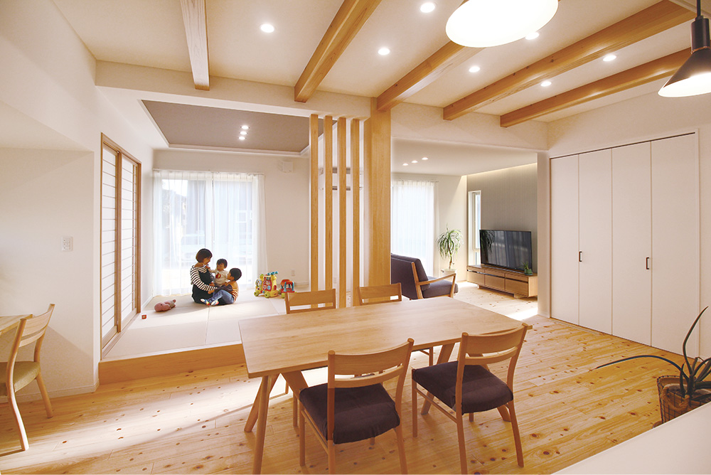 自社製の桧フローリングと杉の化粧梁等、無垢の木の彩りを感じられる癒しの空間です。