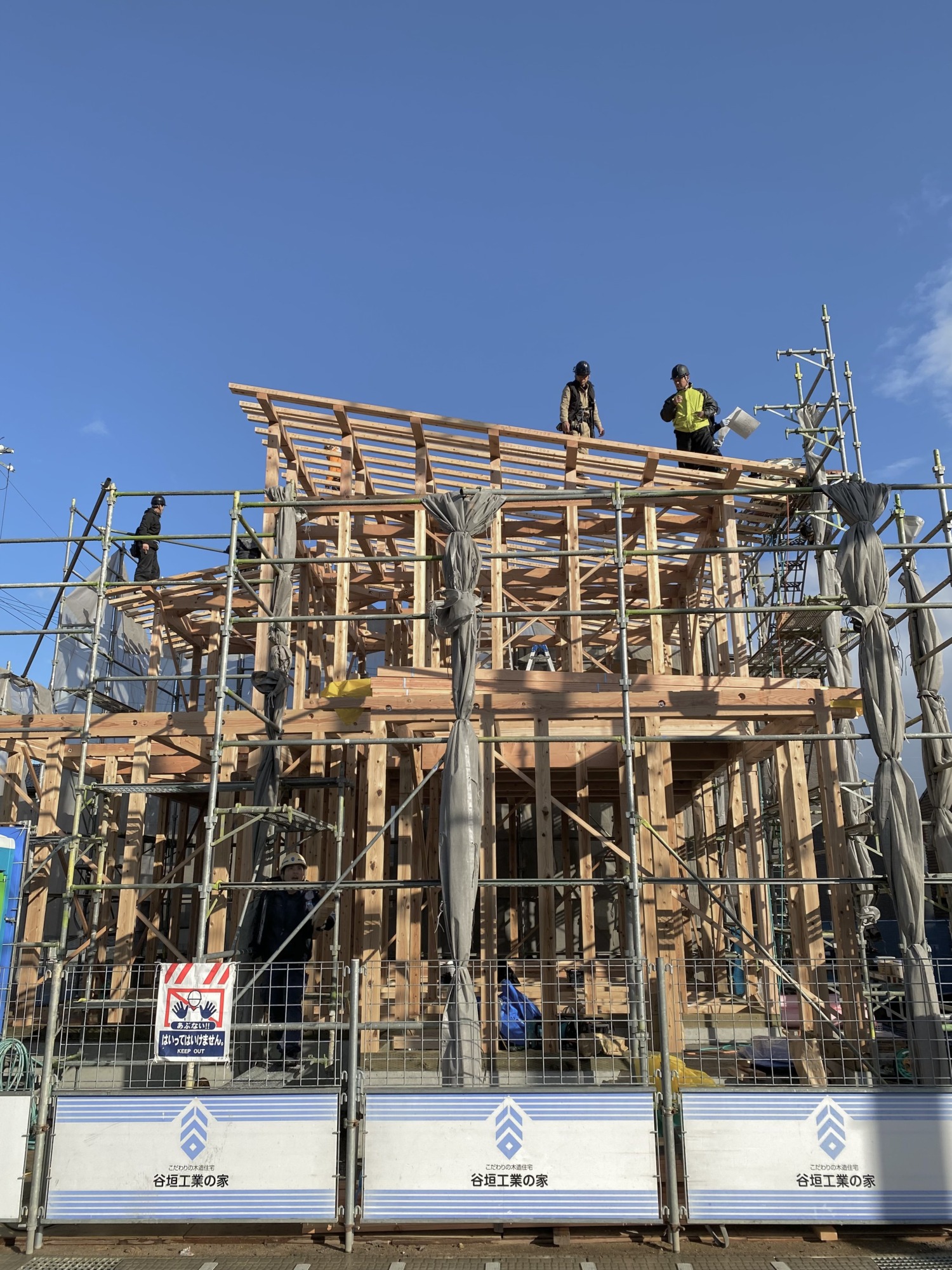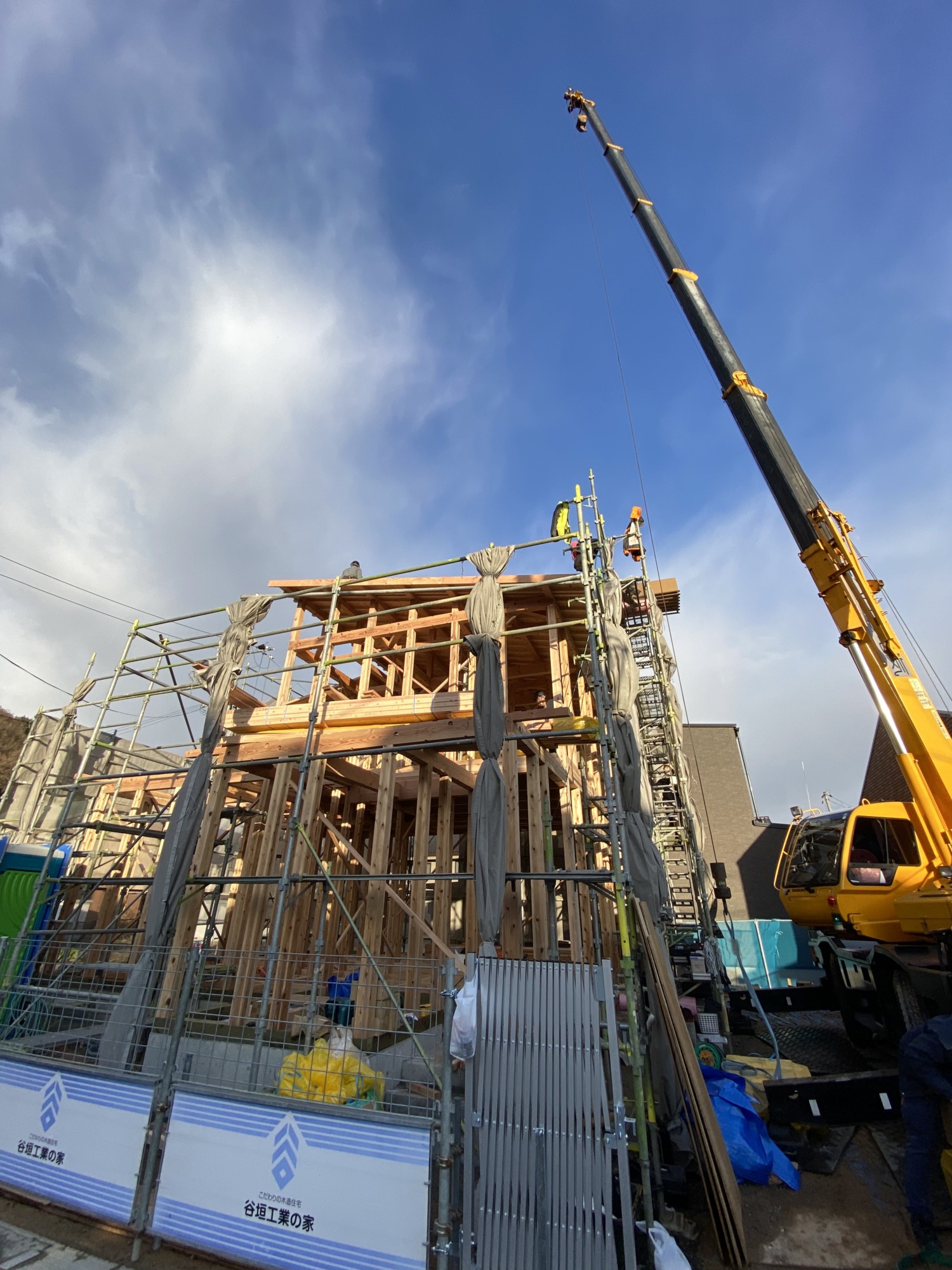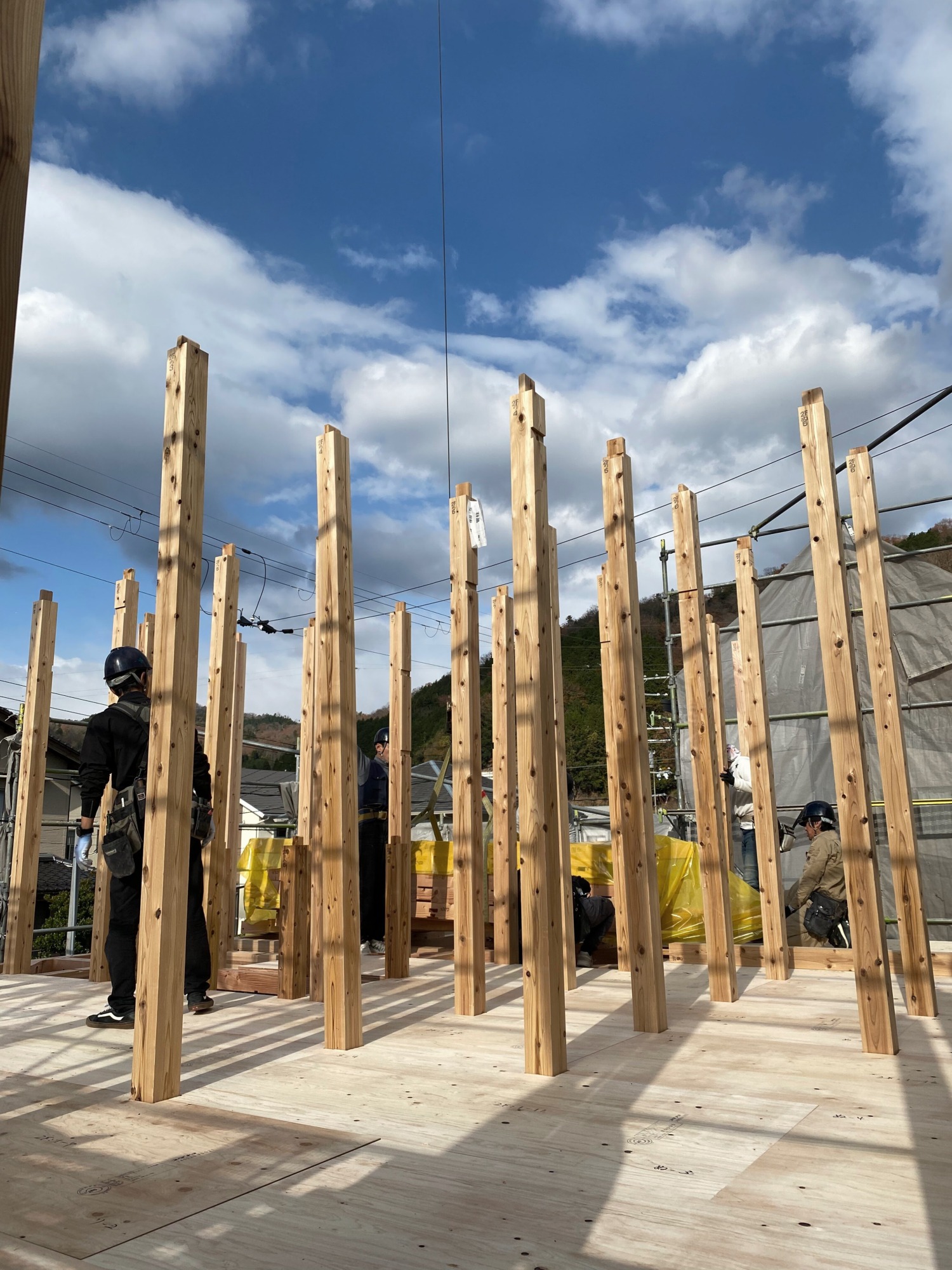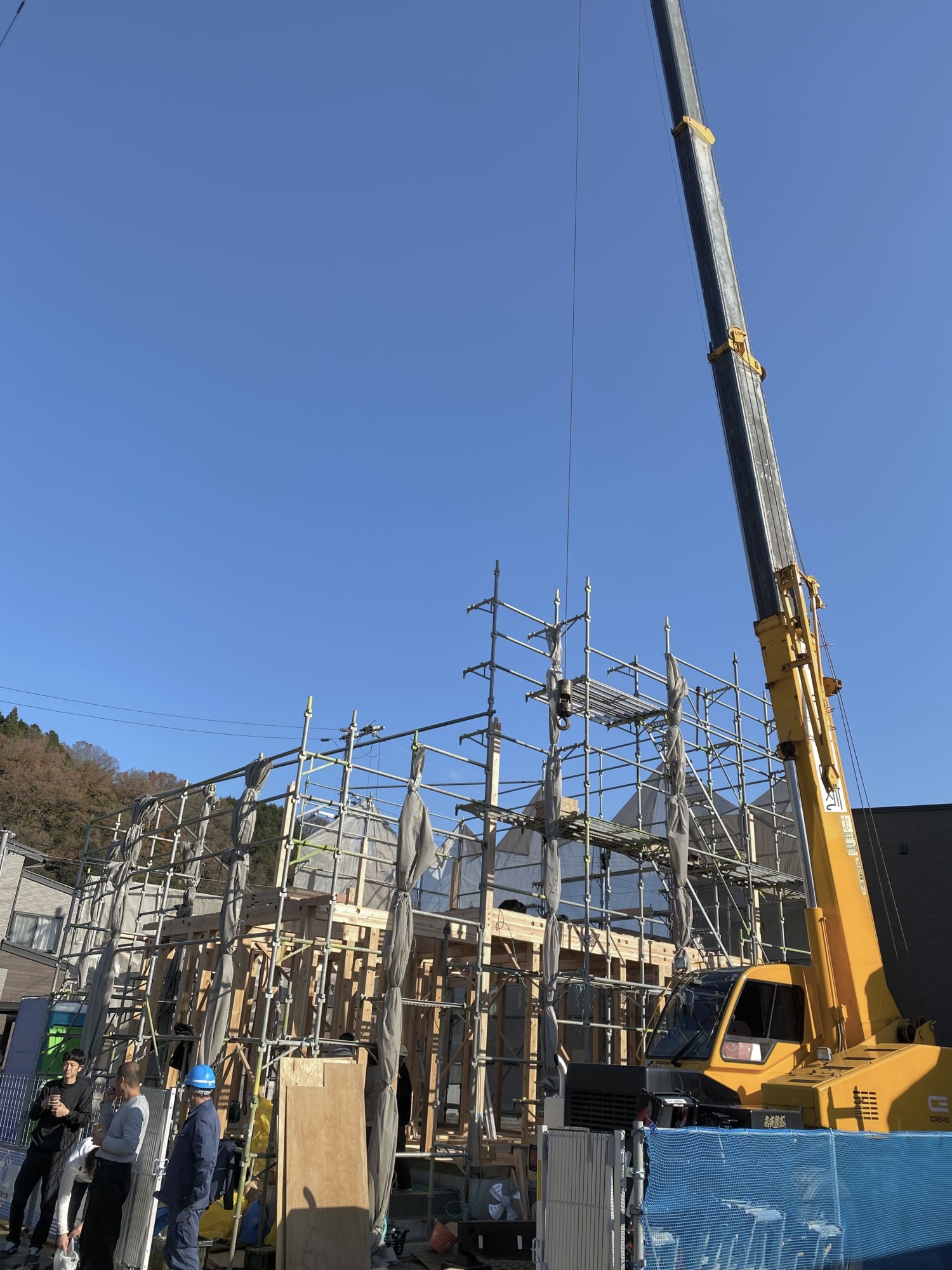 早朝は気温が冷え込み、天候も心配された上棟当日…お昼前には見事な快晴になりました!